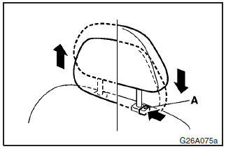 To raise the head restraint, move it upward. To lower the restraint, move it downward while pushing the height adjusting knob (A) in the direction of the arrow. After adjustment, push the head restraint downward and make sure that it is locked.